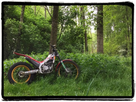 Stefaan liet ons onze uitrusting* aantrekken, gaf een kort woordje uitleg over de motoren (altijd rijden met een vinger op rem- en ontkoppelingshendel) en daarna mochten we op een vlak stuk tussen wat bomen even “inrijden”.