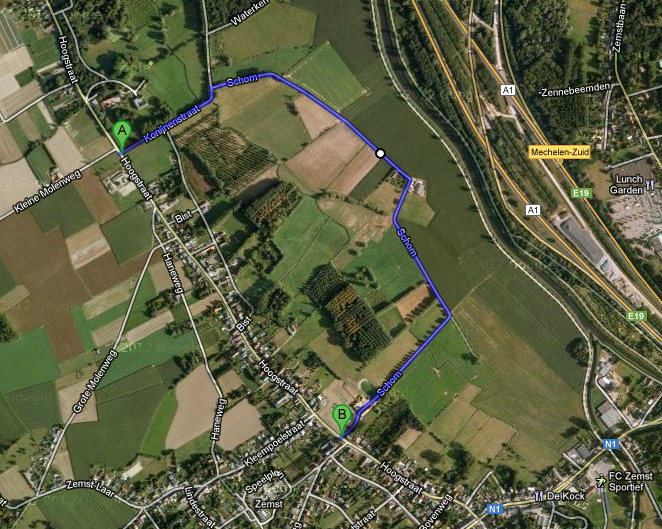 Maar dat liep niet zoals gepland. Van hier tot hier geen onverharde weg, maar veld. En in veldcross had ik geen zin. Dus zat er niks anders op dan rechtsomkeer maken en een andere weg zoeken om tot aan de Verbrande Brug raken. Dat ging dan via de Mechelbaan: